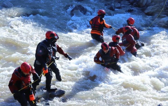 ▲경북119특수대응단이 실종자 수색작업을 하고있다/경북소방본부[안동=뉴스채널A] 경북 예천군 호명면에서 산사태 실종자를 수색하던 해병대원이 급류에 실종됐다.19일 경북소방본부와 해병대 등에 따르면 이날 오전 9시 10분께 예천군 호명면 황지리 내성천 보문교 일원에서 수