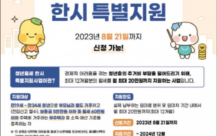 경기 시흥시는 저소득 청년층에게 최대 1년간 월 최대 20만 원의 임차료를 지원하는 청년 월세 한시 특별지원사업의 신청을 8월 21일까지 접수받는다고 밝혔다. 이 사업은 주거비 지출에 어려움을 겪는 저소득 청년층의 주거비 부담을 덜어주기 위해 한시적으로 추진하는