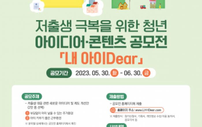 LH가 저출생 문제에 대한 사회적 관심과 공감도를 높이고 보다 실효성 있는 대책 마련을 위한 '내 아이 Dear' 아이디어 공모전을 실시한다고 밝혔다. 이번 공모전은 범국가적 위기 상황이 된 저출생 현상에 대해 2030 청년세대의 목소리를 직접 듣고 그들의 의견을