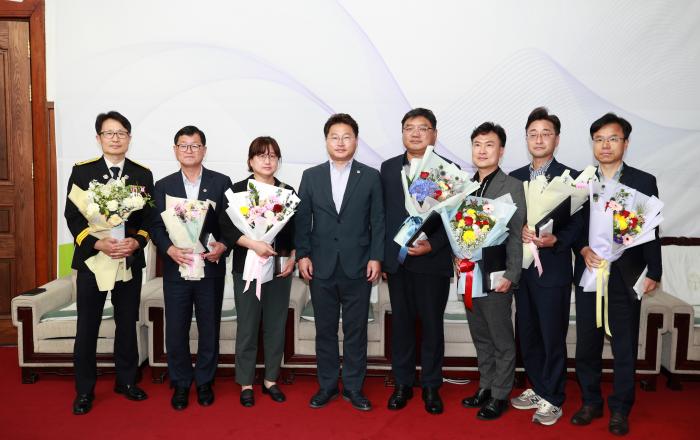 충청북도는 5일 도청에서 2023년 상반기 성과가 우수한 7개 부서에 ‘도정 으뜸상’을 시상했다. 수상부서는 인구정책담당관, 보건정책과, 바이오정책과, 관광과, 농업정책과, 회계과, 청주동부소방서 7개 부서로, 지난 6월 15일 열린 도정조정위원회에서 부서별 공적