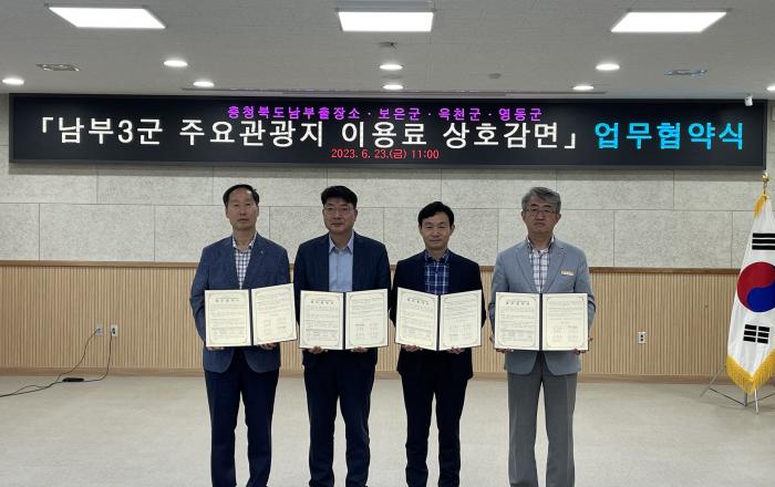 충청북도 남부출장소는 보은·옥천·영동군과 함께 「남부3군 주요관광지 이용료 상호 감면」 추진을 위한 업무협약을 6월 23일(금) 11시 남부출장소 대회의실에서 강찬식 남부출장소장, 우경수 보은 부군수, 김수인 옥천 부군수, 김진석 영동 부군수가 참석하여 체결하였다.