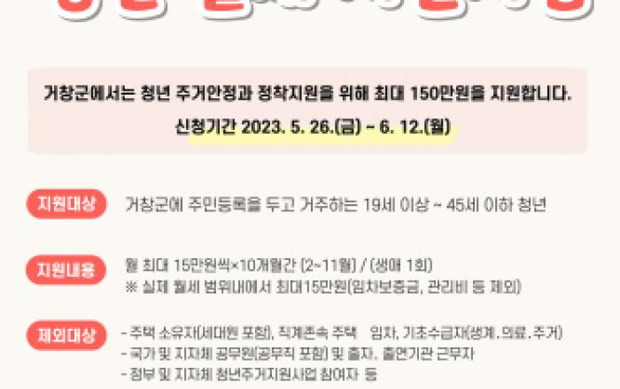 경남 거창군은 청년의 주거비 부담 완화와 정착을 돕기 위해 2023년 청년 월세 지원사업 신청을 이달 26일부터 내달 12일까지 18일간 신청받는다. 지원 금액은 최대 150만 원으로 실제 월세 납부 금액 범위 내에서 매월 최대 15만 원씩 10개월간(2~11월)