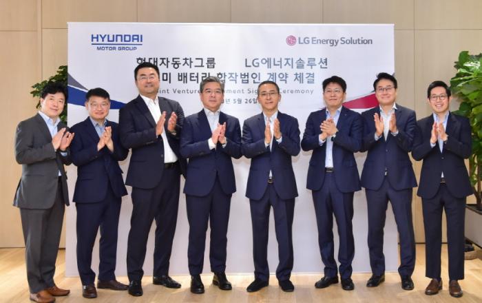 LG에너지솔루션이 현대차그룹과 함께 미국 내 전기차 배터리 합작공장을 건설한다. LG에너지솔루션은 26일 서울 여의도 본사에서 현대차 대표이사 장재훈 사장, LG에너지솔루션 대표이사 권영수 부회장 등이 참석한 가운데 ‘북미 배터리 합작법인 계약 체결식’을