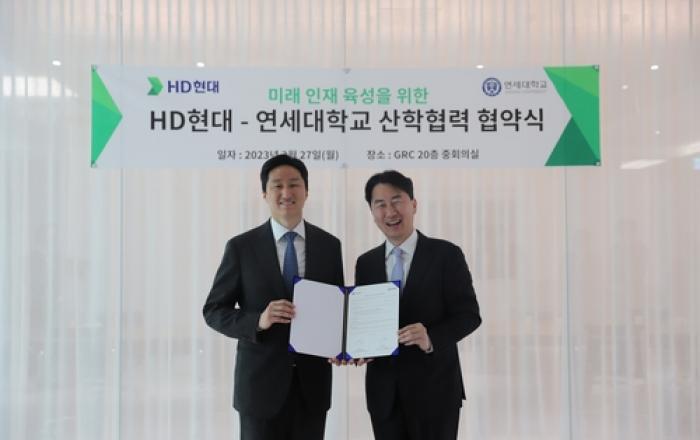 연세대학교 경영대학은 3월 27일(월) HD현대 글로벌R&D센터(GRC)에서 HD현대와 '인재 양성 MOU' 협약식을 가졌다. 연세대 경영대학과 HD현대는 상호 발전을 위한 인재 양성과 산학협력 관계 구축의 필요성을 인식하고 상호 간 이익 증진에 공헌할 목적으로 '