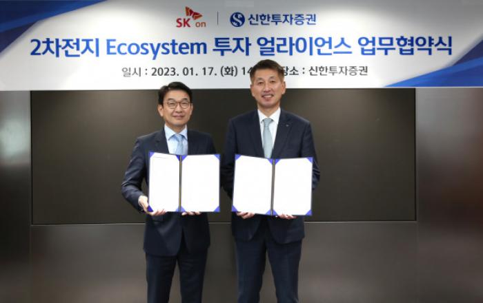 SK온과 신한투자증권이 배터리 산업 생태계 확대를 위해 손을 잡는다. 양사는 17일 오후 서울 영등포구 여의도 소재 신한투자증권타워에서 ‘2차전지 Ecosystem 투자 얼라이언스 구축을 위한 업무협약(MOU)’을 체결했다. 협약식에는 김상태 신한투자증권 사장, 최영찬
