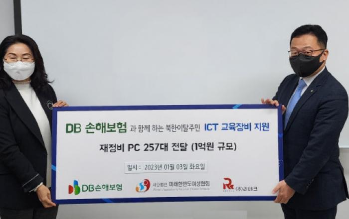 DB손해보험이 3일 국내 유일 북한이탈주민 교육을 지원하는 사단법인 미래한반도여성협회 산하 ICT 교육센터에 257대 규모의 PC 세트를 전달했다고 5일 밝혔다. DB손해보험은 2022년 5월부터 업계에서 처음으로 미래한반도여성협회와 북한이탈주민들의 안정적 국내 정착을