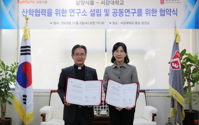 삼양식품은 서강대학교(이하 서강대)와 2일 산학협력을 위한 연구소 설립 및 공동연구를 위한 업무협약을 체결했다고 3일 밝혔다. 이날 협약식은 서강대 총장실에서 진행됐다. 김정수 삼양식품 부회장, 장재성 삼양식품 부사장, 전병우 삼양식품 전략운영본부본부장, 김홍범 삼양식