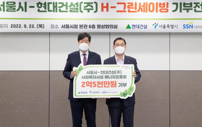 현대건설은 지난 22일 서울시청 본관에서 서울시, 서울특별시사회복지협의회와 함께 사회복지시설 대상으로 에너지효율 개선을 위한 ‘H-그린세이빙’ 사업 기부 전달식을 진행했다고 밝혔다.이번 전달식을 통해 현대건설은 ‘H-그린세이빙’ 사업 지원을 위한 자체 기부금과 전 임직