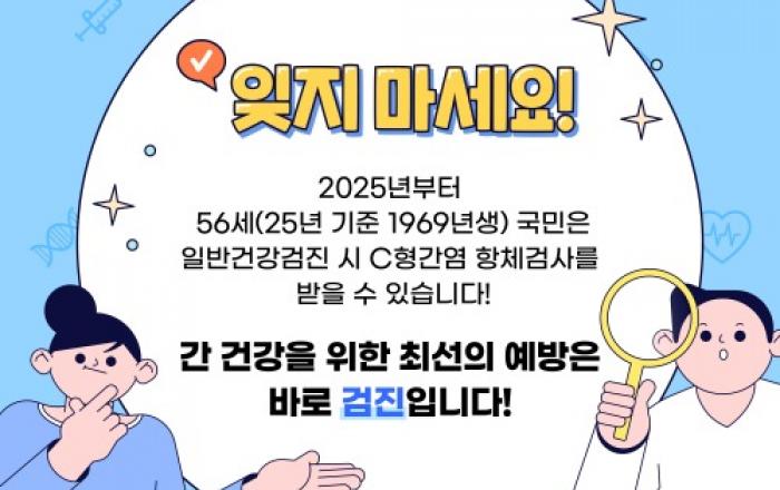 전라남도는 올해부터 56세에 해당하는 도민은 국가건강검진을 받을 때 C형간염 항체 검사를 받을 수 있다고 밝혔다.특히 국가건강검진에서 C형간염 항체 양성으로 결과를 통보받은 도민에게는 확인 진단 검사(HCV RNA 유전자 검출 검사)에 필요한 진찰료와 확진 검사비 본인