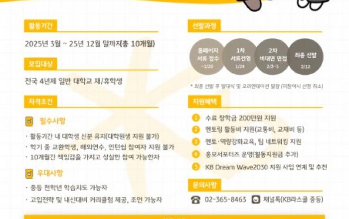 사회복지법인 아이들과미래재단은 KB국민은행의 사회공헌 사업인 ‘KB Dream Wave 2030’의 일환으로 진행되는‘KB라스쿨(중등)’ 프로그램의 2025년도 참가자를 모집한다.‘KB라스쿨 중등’은 2008년부터 시작돼 지난 17년간 총 1053개의 기관과 협력하며