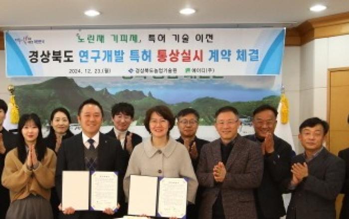 경상북도농업기술원은 23일 ‘노린재 기피제를 이용한 노린재 방제방법’ 특허 기술에 대해 곤충 페로몬을 이용한 친환경 해충방제 전문기업인 ㈜에이디와 통상 실시 계약을 체결했다.노린재는 기주범위가 넓어 과수뿐만 아니라 밭작물에도 피해를 주는 해충으로 과실을 구침으로 직접