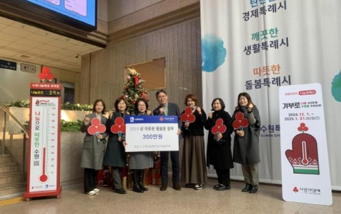 수원새빛형어린이집협의회가 “수원시 취약계층 아동을 위해 사용해달라”며 수원시에 성금 300만 원을 기부했다. 전달식은 24일 시청 본관 로비에 설치된 사랑의 온도탑 앞에서 열렸다.수원새빛형어린이집 55개소가 성금을 모금했다. 수원시는 경기사회복지공동모금회 지정기탁방식으