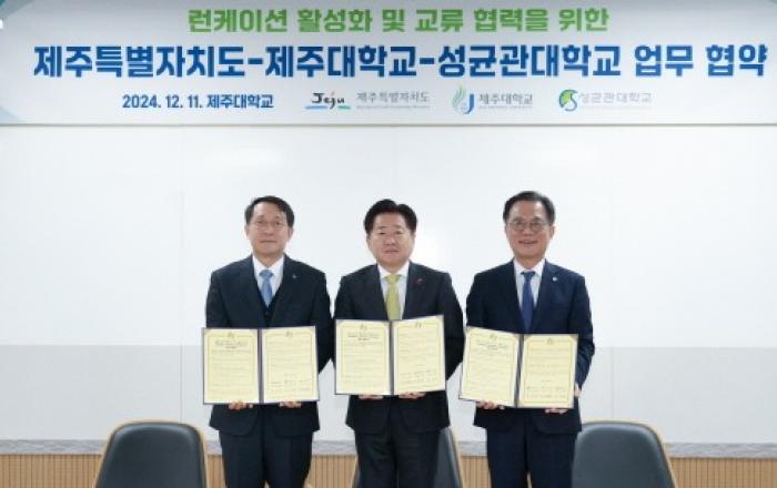 제주특별자치도가 성균관대학교, 제주대학교와 손잡고 런케이션(Learning+Vacation) 활성화와 첨단 분야 교육·연구 협력, 지역사회 문제 해결에 시동을 걸었다.제주도는 11일 오전 제주대학교 디지털도서관 라이브러리홀에서 두 대학과 교육혁신 협력체계 구축을 위한