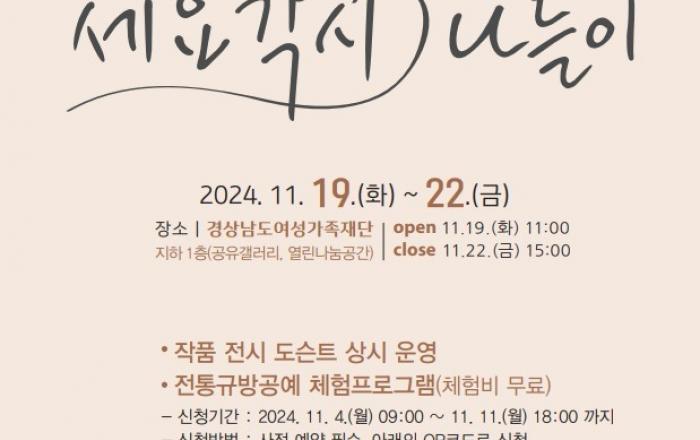 경상남도농업기술원은 오는 19일부터 22일까지 4일간 경상남도여성가족재단(공유갤러리, 열린나눔공간)에서「도민과 함께하는 세요각시 나들이」를 개최한다고 밝혔다.이번 전시는 전통생활문화연구회 회원들이 직접 기획하고 준비한 행사로 전통 규방공예의 전통과 가치를 잇고 현대적