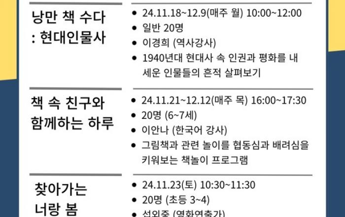 수원시 창룡도서관이 인권의 소중함을 느끼고 체험할 수 있는 ‘인권주간 프로그램’의 참가자를 모집한다. 창룡도서관은 아동학대예방의 날(11월 19일)과 세계인권선언기념일(12월 10일)을 맞아 성인, 어린이, 유아 등 전 연령대가 참여할 수 있는 다양한 프로그램을 준비했