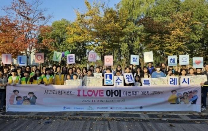 수원시가 아동 관련 기관·시민들과 함께 2일 광교호수공원에서 아동학대 예방 캠페인 ‘시민과 함께하는 I LOVE 아이’를 펼쳤다. 이날 캠페인에는 수원시, 수원아동보호전문기관, 수원시아동참여위원회, 수원교육지원청, 매원초 자원봉사단, 아동돌봄수원센터, 수원시청소년성문화