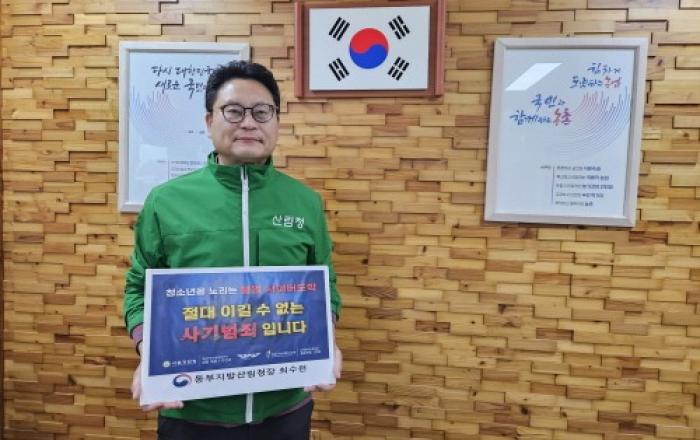 최수천 동부지방산림청장은 오는 22일 김도형 강원영동병무지청장에게 지목받아 ‘청소년 도박 근절 릴레이 챌린지’에 동참하였다.‘청소년 도박 근절 릴레이 챌린지’는 청소년 대상 불법 사이버 도박의 위험성을 국민에게 알리는 캠페인으로 올해 3월부터 경찰청 주도로 시작되어 다
