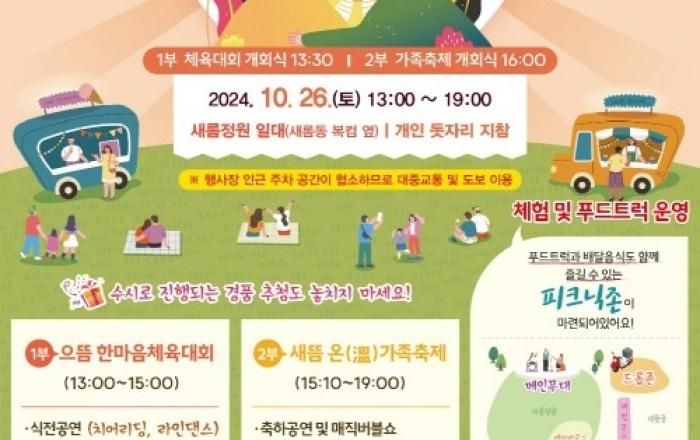 세종특별자치시 새롬동이 오는 26일 새롬동 행복누림터(복합커뮤니티센터) 인근 새롬정원(체육시설부지)에서 ‘으뜸 새뜸 온(溫)가족 축제’를 개최한다.올해 축제는 가족을 주제로 풍성한 볼거리와 놀거리, 먹거리를 즐길 수 있는 행사로 열린다.먼저 1부 한마음체육대회는 오는