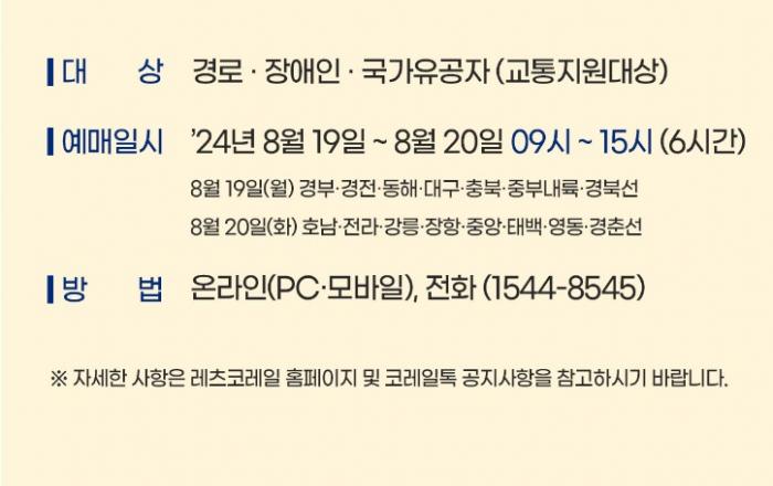 한국철도공사(코레일)가 이달 19일부터 22일까지 나흘간 ‘2024년 추석 열차승차권’ 예매를 온라인(PC, 모바일)과 전화(고객센터)로 시행한다.추석 승차권 예매 대상은 9월 13일부터 18일까지 6일 동안 운행하는 KTX·ITX-새마을·무궁화호 열차 등이다.코레일