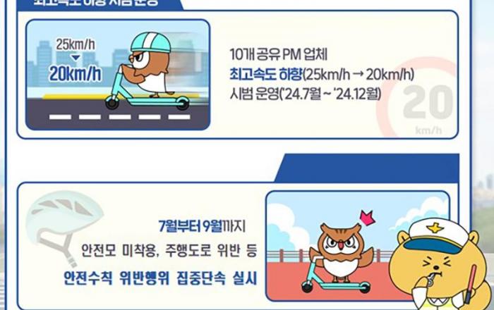 정부가 개인형 이동장치 사고 예방을 위해 현행법상 시속 25km인 개인형 이동장치 최고속도를 시속 20km로 제한하는 시범운영 사업을 실시한다. 이에 시범운영은 총 10개 대여업체가 참여하는데, 이번 달인 7월부터 올해 12월 말까지 서울과 부산 등 전국 주요 도시에서