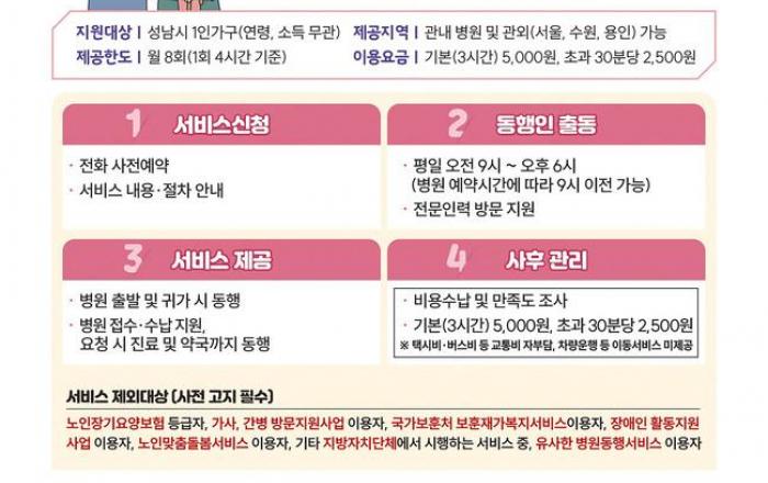 성남시는 혼자 병원에 가기 어려운 1인 가구를 위한 병원 안심동행 사업을 운영하고 있다고 19일 밝혔다.병원 안심동행 사업은 고령, 거동 불편 등으로 혼자 병원을 이용하는 데 어려움을 겪는 1인 가구를 대상으로 동행인이 보호자 역할을 맡아 병원 이용을 지원하는 사업이