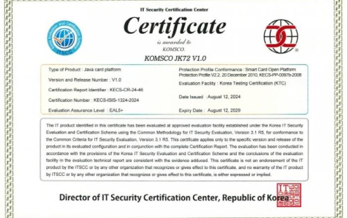 한국조폐공사는 21일 국산 반도체 칩을 적용해 공사가 자체 개발한 칩 운영체제(Chip Operation System, 이하 ‘COS’) JK72가 정부기관으로부터 최고 수준의 보안인증 CC EAL5+를 획득했다고 밝혔다. 이를 통해 현재 외국산 칩과 국산 운영체제로