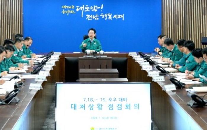 김영록 전라남도지사는 19일 오전 재난종합상황실에서 재난 협업부서 실국장이 참석한 가운데 호우 대처상황 점검회의를 주재, 산사태 취약지역 사전대피 및 농작물 병충해 대책 등에 총력을 기울일 것을 당부했다.전남도에 따르면 지난 15~19일 도내 평균 88mm의 비가 내