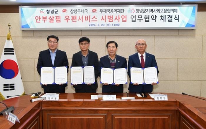창녕군은 지난 29일, 관내 복지 사각지대 발굴과 지원에 협력하기 위해 창녕우체국 및 우체국공익재단, 창녕군지역사회보장협의체와 '안부살핌 우편서비스 사업' 업무협약을 체결했다. 이번 협약은 창녕군이 행정안전부에서 주관한 '2024년 읍면동 스마트 복지안전 서비스 개