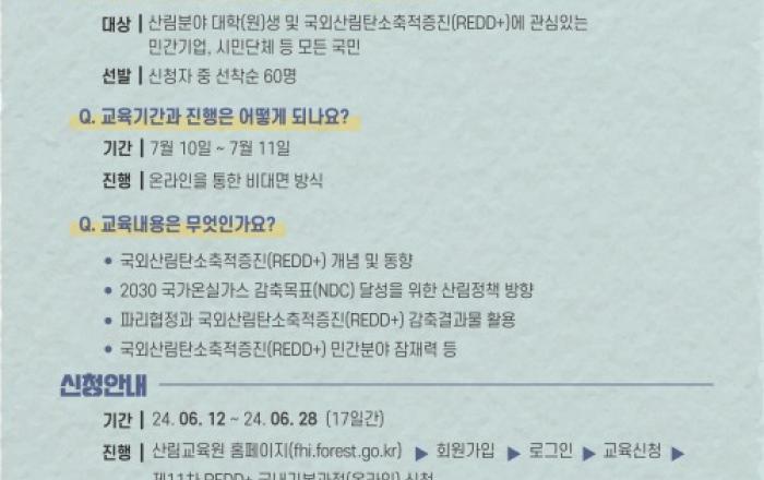 산림청은 오는 28일까지 국외산림탄소축적증진(REDD+) 기본과정 교육생을 모집한다고 밝혔다. 국외산림탄소축적증진(REDD+)이란 개발도상국의 산림전용과 황폐화를 막고 산림의 탄소흡수원 기능을 강화하여 탄소 배출을 저감하는 활동을 말한다.