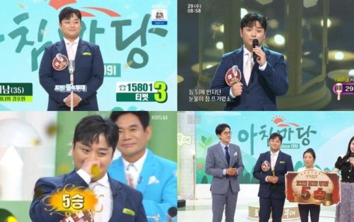 태남이 마지막 '도전 꿈의 무대'에서 5승에 성공했다. 오늘 29일 KBS1 '아침마당 - 도전 꿈의 무대'에 태남이 출연했다. 지난 3승과 패자부활전 1승까지 총 4승을 거머쥔 태남은 마지막 출연인 오늘 무대에서 5승에 도전했다. 지난 방송에서 태남은 아버지의