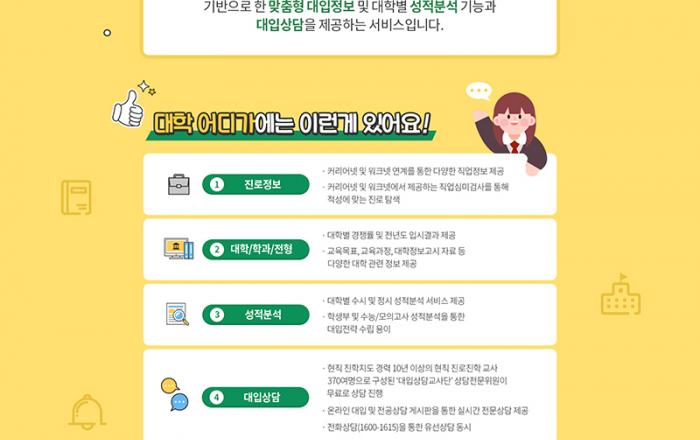 # 재수생인 첫째 자녀의 대학 진학을 위한 정보를 얻으려고 사설 입시업체에 문의해보니, 생각보다 많은 비용이 들었다. 고심하던 A씨는 교육부의 「대입정보포털 어디가」를 통해 모형제작과 드론에 관심이 많은 첫째 자녀의 진로에 관한 대학과 학과를 한눈에 찾아볼 수 있었다.