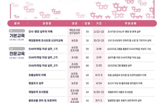 문화재청은 (사)한국문화유산협회와 함께 11월까지 매장유산 조사인력의 역량·전문성 및 안전의식 향상을 위하여 「2024년도 매장유산조사 분야 전문교육」을 시행한다. 교육 대상은 발굴조사기관, 박물관, 연구소 등에 재직하는 매장유산 조사인력을 비롯하여 관련학과 대학(원)