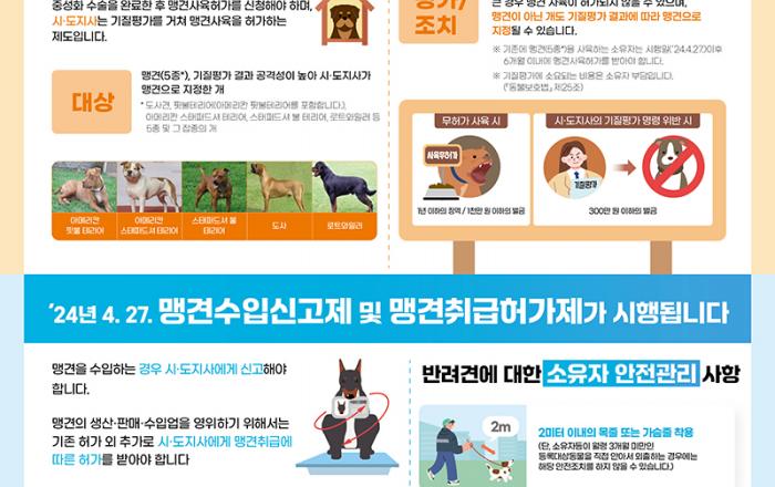 앞으로 개물림 사고 방지 등을 위한 맹견사육허가제가 도입된다. 단, 사람 또는 동물을 공격해 다치게 하거나 죽게 한 경우에는 허가를 취소할 수 있게 된다. 또 승강기, 복도 등의 실내 공용공간에서 맹견관리에 대한 의무가 강화되고 반려동물행동지도사 국가자격도 도입돼