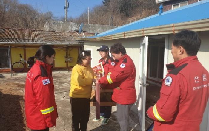 울진산림항공관리소는 설 명절을 맞아 8일 울진군 기성면 소재의 취약계층을 찾아가 위문품을 전달하고 애로사항을 청취하는 시간을 가졌다. 이번 위문에서 관리소는 우리 사회에 나눔 문화를 조성하고 즐겁게 보내야 할 설 명절에 취약계층 등