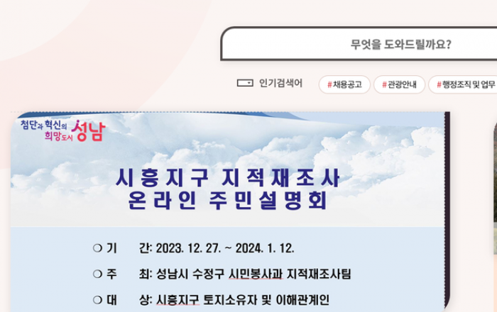성남시는 2024 년도 지적재조사사업에 대한 온라인 주민설명회를 각 구청 홈페이지에서 진행 중이 다 . 지적재조사는 토지의 실제 이용 현황과
