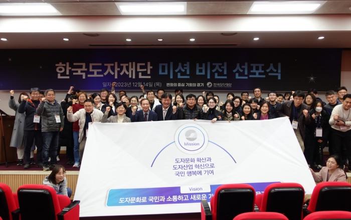 한국도자재단이 14일 양평 코바코연수원에서 ‘비전 선포식’을 열고 새 미션으로 ‘도자문화 확산과 도자산업 혁신으로 국민 행복에 기여’를 설정하고 ‘도자문화로 국민과 소통하고 새로운 가치를 창조하는 전문기관’이라는 새 비전을 공표했다. 재단은 올