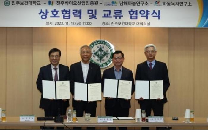 (재)남해마늘연구소는 지난 17일 진주보건대학교 대회의실에서 진주보건대학교, 진주바이오산업진흥원, 하동녹차연구소와 상호협력을 위한 업무협약을 체결했다고 밝혔다. 이번 협약은 진주보건대학교에서 추진 중인 지방 전문대학 활성화 사업의 일환으로, 상호 간 거버넌스 구축을