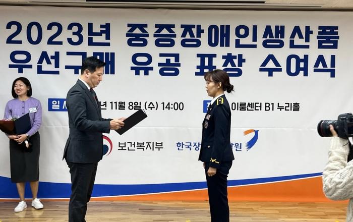해양경찰청은 보건복지부 주관 전국 중앙행정기관과 지자체, 공공기관을 대상으로 실시한「중증 장애인생산품 우선구매 실적 평가」에서 최우수기관으로 선정되어 보건복지부장관상을 수상하는 영예를 안았다. 중증장애인 우선구매 제도는 중증장애인 고용생산 시설에서 만든 물품