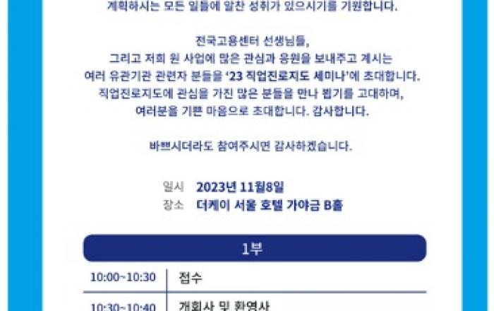 한국고용정보원은 11월 8일(수) 10시, 더케이 호텔(서울 서초구)에서 「2023 직업진로지도 세미나」를 개최했다. 직업진로지도 세미나는 고용서비스 분야의 종사자들이 함께 모여 진로경력개발 서비스 협력을 강화하고 의견을 교류하기 위한 장으로 매년 개최하고 있다.