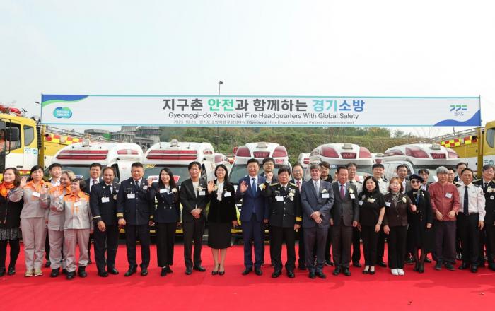 경기도소방재난본부는 소방차량 무상양여 200대 돌파를 기념해 26일 오산 경기도국민안전체험관에서 ‘소방차량 무상양여식’을 개최했다. 양여식에는 올해 소방차량 지원 대상인 5개 국가(캄보디아·몽골·키르기스스탄·페루·필리핀)의