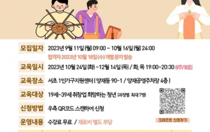 서초구가 10월부터 운영 예정인 2023 하반기 서초청년 크래프트(예비창업자 과정) 참여자를 모집한다. 서울 서초구(구청장 전성수)는 다양한 수공예 교육을 통해 서초구에 거주하거나 활동 중인 공예 관련 청년들의 취창업을 지원하는 '서초청년 크래프트 예비창업자 과정'