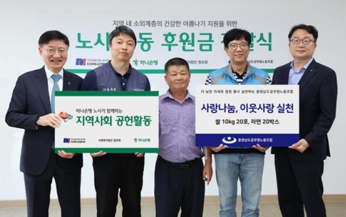 하나은행 노사는 충청남도 홍성에 위치한 청로노인종합복지센터에서 지역사회 소외계층을 지원하고자 충청남도공무원노동조합과 함께 사회복지법인 청로회 앞 기부금과 기부물품을 전달했다고 밝혔다. 이번 하나은행 노사의 지역사회 소외계층을 위한 나눔 활동은, 지난 2월 시행한 금