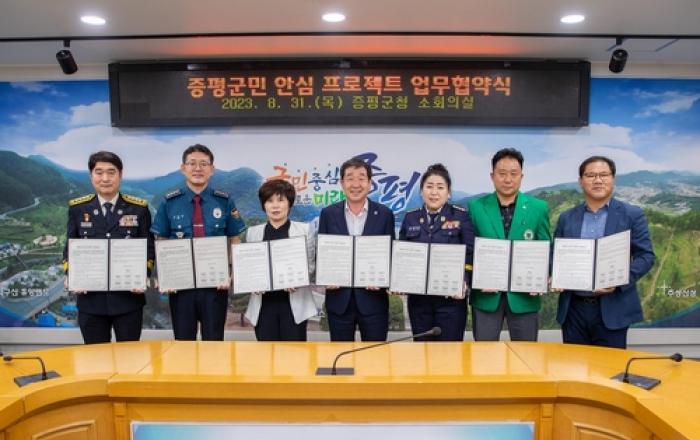 충북 증평군이 군민이 안심하고 생활할 수 있는 안전한 도시 구현을 위해 적극 나섰다. 군은 지난 31일 군청 소회의실에서 증평군의회, 괴산경찰서, 증평소방서, 증평군자율방범연합대, 증평군지역자율방재단, 증평군의용소방연합회와'증평군민 안심 프로젝트' 업무협약을 체결했