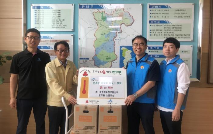 과학기술정보통신부노동조합이 지난 17일 전의면 행정복지센터를 찾아 수해피해 이웃 등을 위해 사용해달라며 햄 10상자를 전달했다. 전의면은 전달받은 햄을 지역 내 수해피해 이웃, 취약계층 가구 등에게 전할 예정이다. 송관영 과학기술정보통신부노동조합 위원장은 “작은
