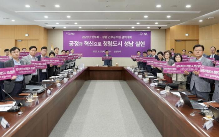 성남시는 17 일 신상진 시장을 비롯해 간부 공무원과 산하기관 대표들이 참가한 가운데 반부패 ‧ 청렴 내용을 점검하고 ,