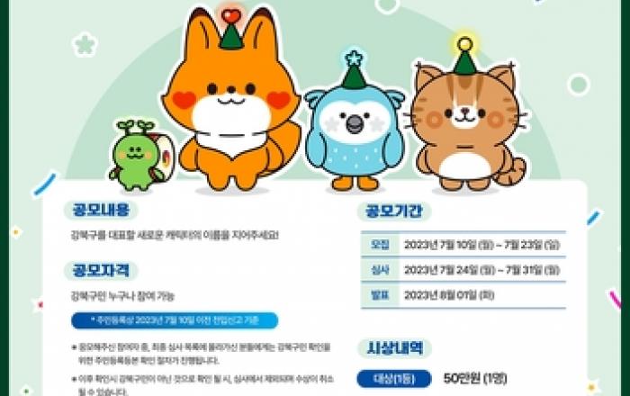 서울 강북구는 구의 대표 캐릭터 이름을 짓기위해 오는 10일부터 23일까지 '캐릭터 네이밍 공모전'을 개최한다고 밝혔다. 구는 앞서 강북구를 대표하는 캐릭터를 만들기 위해 5월 15일부터 6월 14일까지 캐릭터 공모전을 개최했다. 접수기간 동안 총 139개의 작품이