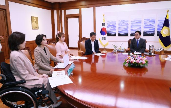 우원식 국회의장은 17일 오전 의장집무실에서 서영석·김예지·서미화·최보윤 의원과 국회 장애인 정책의 실효성 확대를 위한 간담회를 가졌다.이 자리에서 우 의장은 “장애인의 삶이 곧 우리 사회의 수준으로, 장애인 정책은 당사자의 관점에서 펼치지 않으면 안 된다”며 “국회