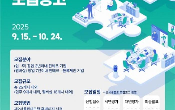 국내 유일의 초기 핀테크 스타트업 창업 지원 시설인 제2서울핀테크랩은 2026년 입주 및 멤버십 기업 25개 사 내외를 10월 24일(금)까지 모집한다고 밝혔다.제2서울핀테크랩은 2023년 1월 마포구 도화동에 개관한 초기 핀테크 스타트업을 육성하는 기관이다. 체계적인