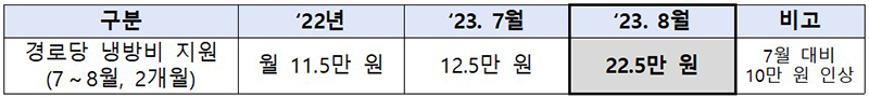 한편 염민섭 복지부 노인정책국장은 “경로당 냉방비 지원을 통해 어르신들이 경로당(무더위쉼터)에서 여름을 시원하고 안전하게 지내실 수 있을 것으로 기대한다”고 밝혔다.