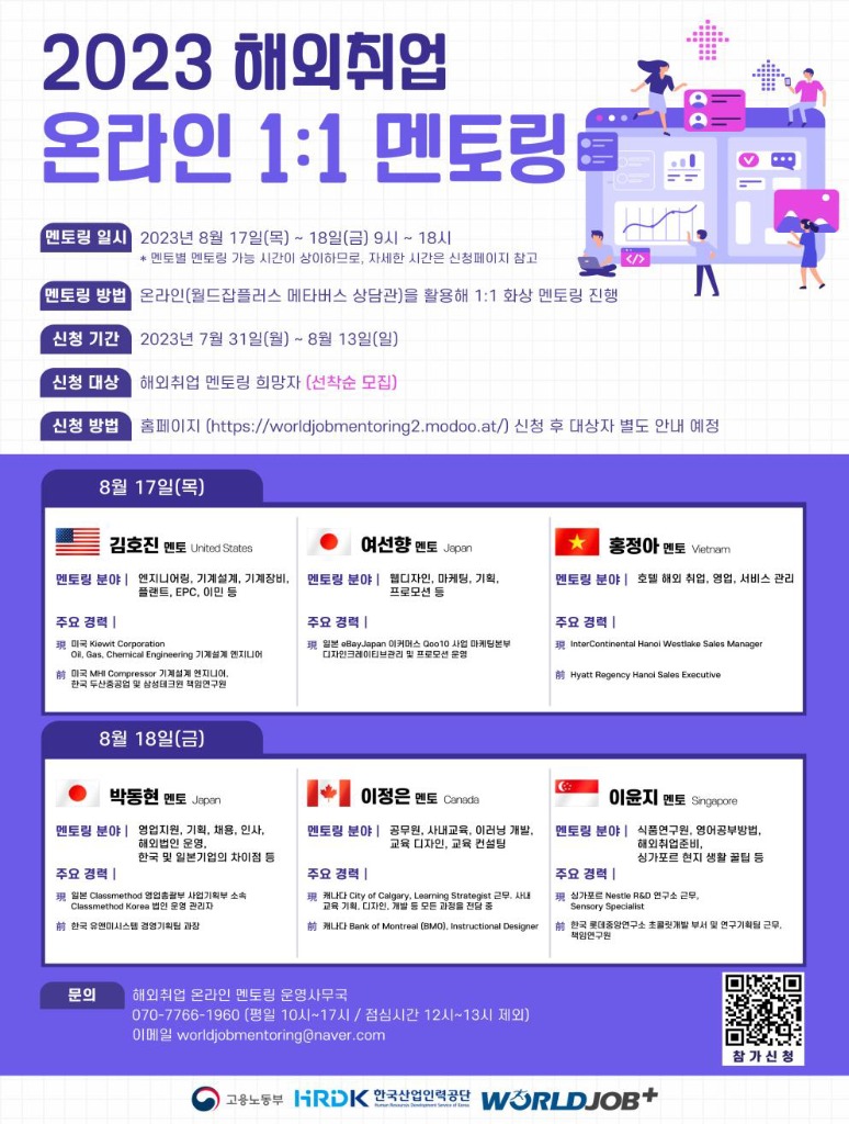 또한 17일과 18일 양일간 진행하는 해외취업 온라인 1:1 멘토링도 월드잡 유니버스에서 열린다. 미국, 일본 등 주요 5개국에 진출한 6명의 멘토가 90여 명의 멘티에게 취업 정보와 전략을 맞춤형으로 제공할 계획이다.